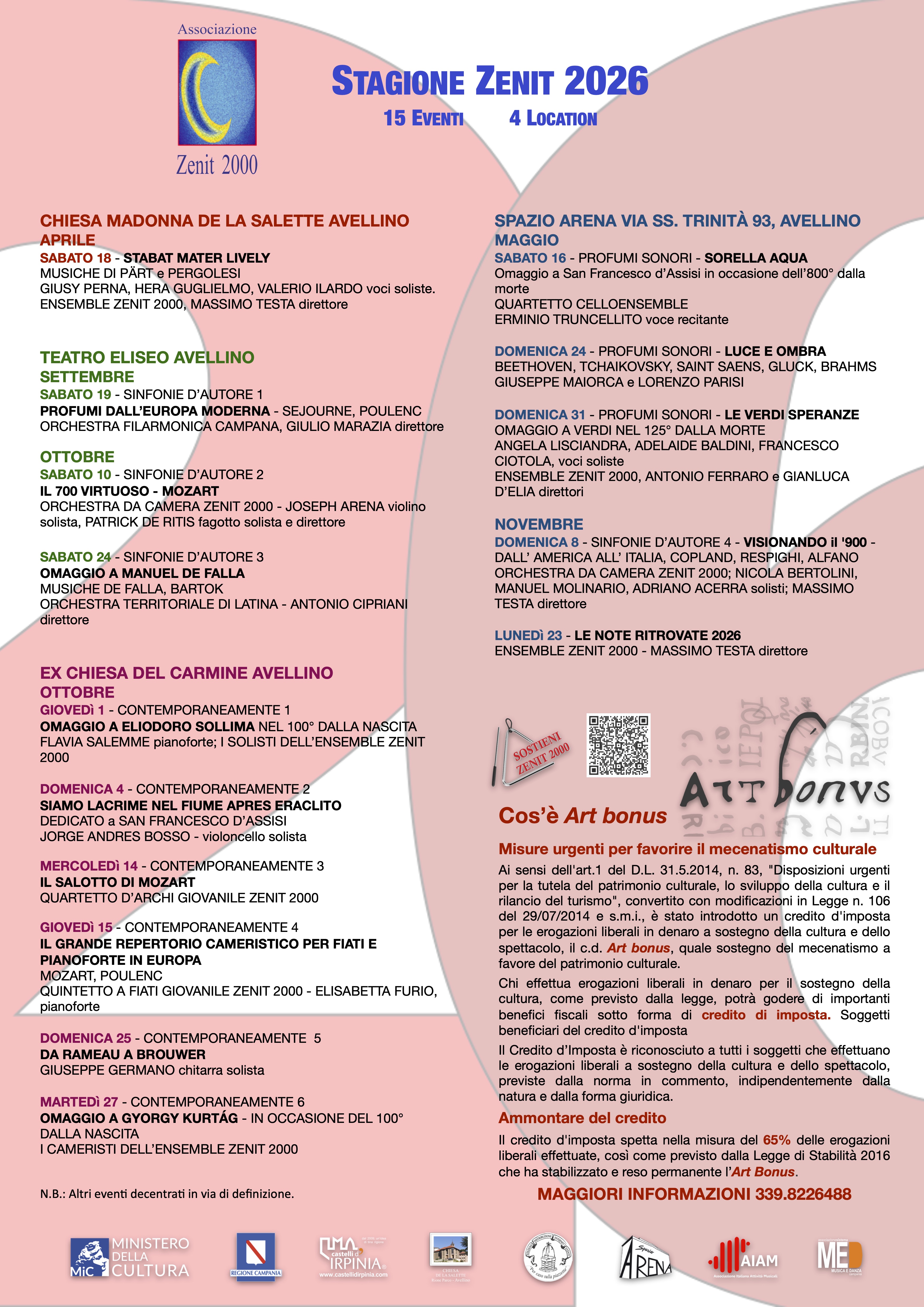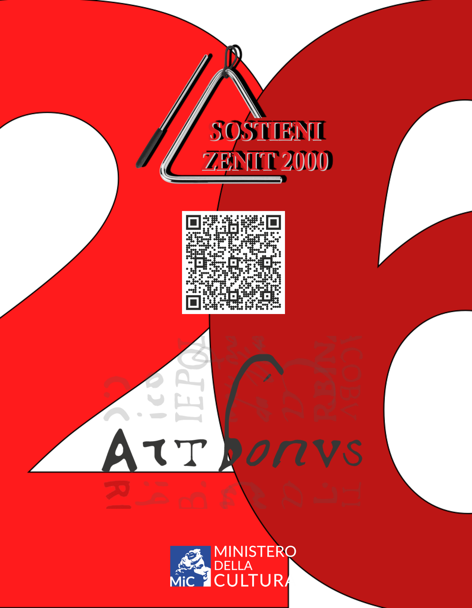 L'Associazione Zenit 2000, in occasione dei suoi 26 anni di attività in ambito musicale e artistico, propone al grande pubblico l'Intervento per la raccolta di donazioni liberali denominata ART BONUS: Misure urgenti per favorire il mecenatismo culturale. Ai sensi dell'art.1 del D.L. 31.5.2014, n. 83, "Disposizioni urgenti per la tutela del patrimonio culturale, lo sviluppo della cultura e il rilancio del turismo", convertito con modificazioni in Legge n. 106 del 29/07/2014 e s.m.i., è stato introdotto un credito d'imposta per le erogazioni liberali in denaro a sostegno della cultura e dello spettacolo, il c.d. Art bonus, quale sostegno del mecenatismo a favore del patrimonio culturale.